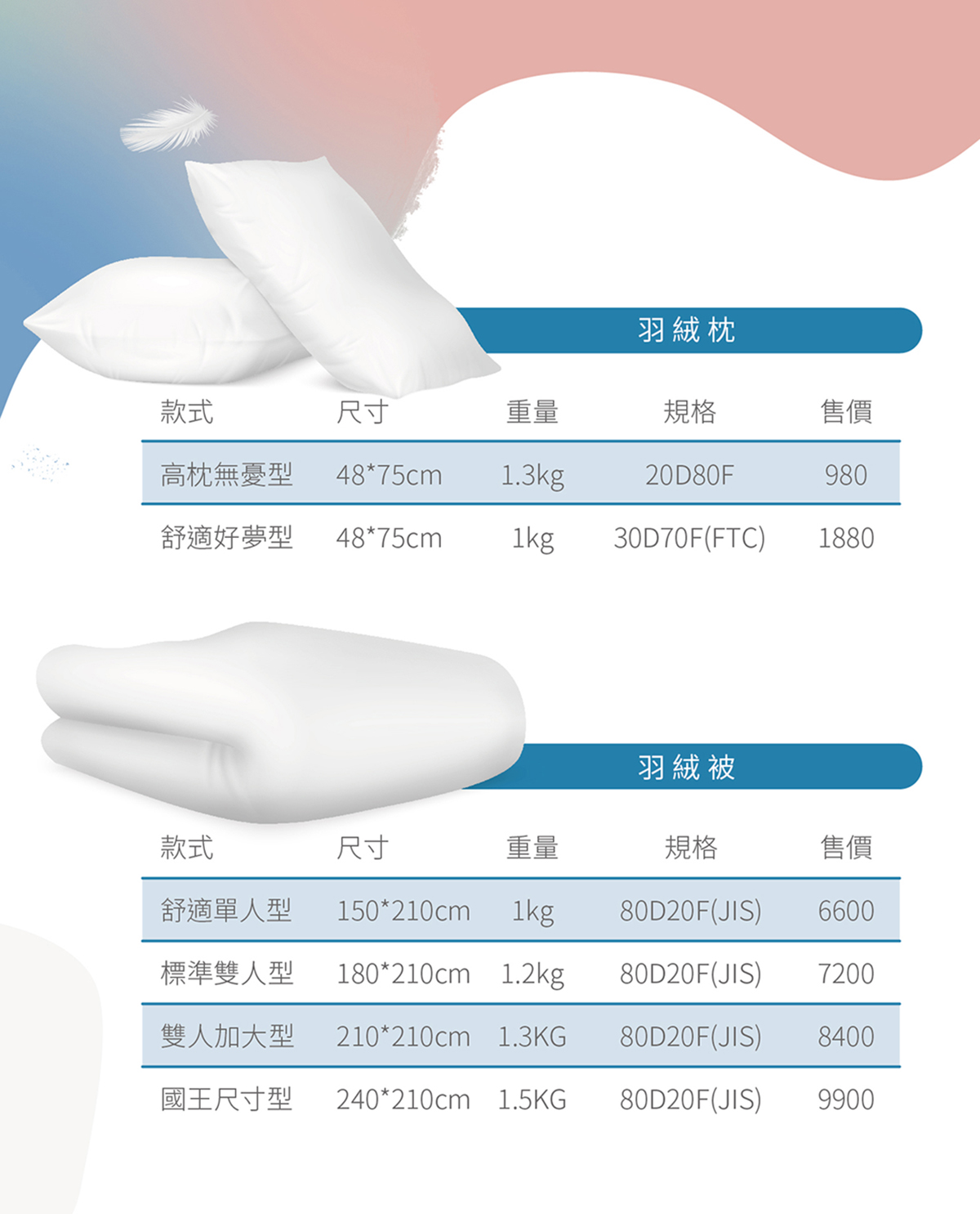1.羽根:為棄狀纖維,具有適當彈性,抗壓力強,故常做為枕頭材料。