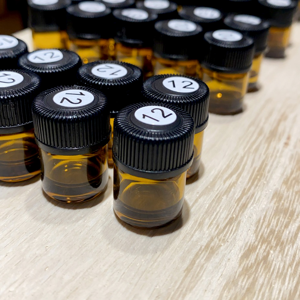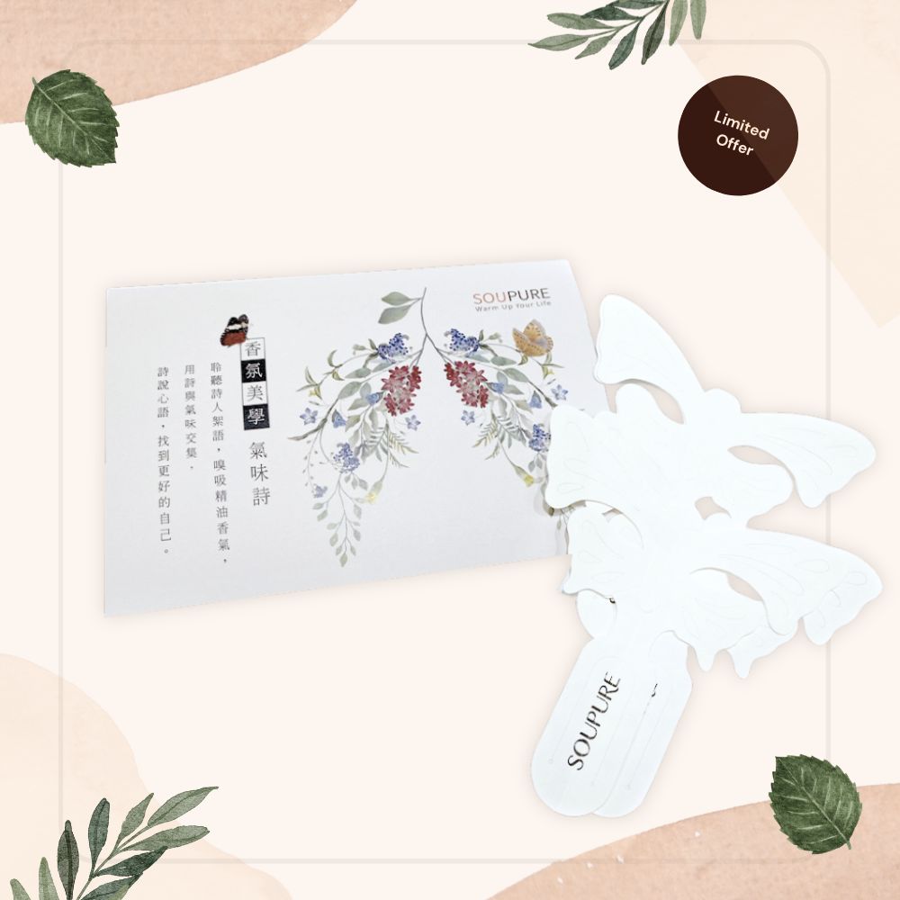 兩款單方純精油各0.5ml、聞香紙x5、香味詩人設計明信片X1使用比例說明。